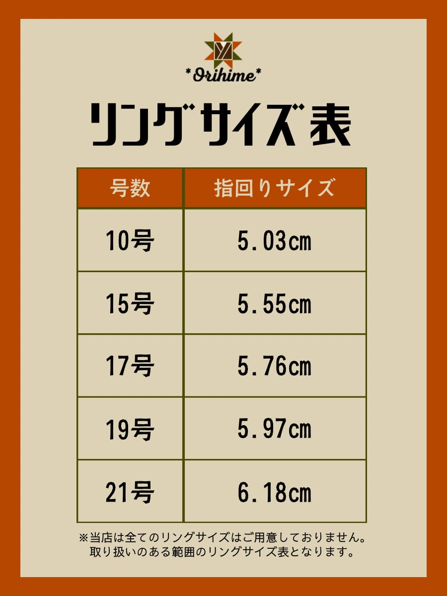 ※ 海外製のリング土台を使用しているため個体差があり、それぞれ少しずつ異なるサイズとなっています。ひとつひとつ計測し、細かく号数を記載しております。