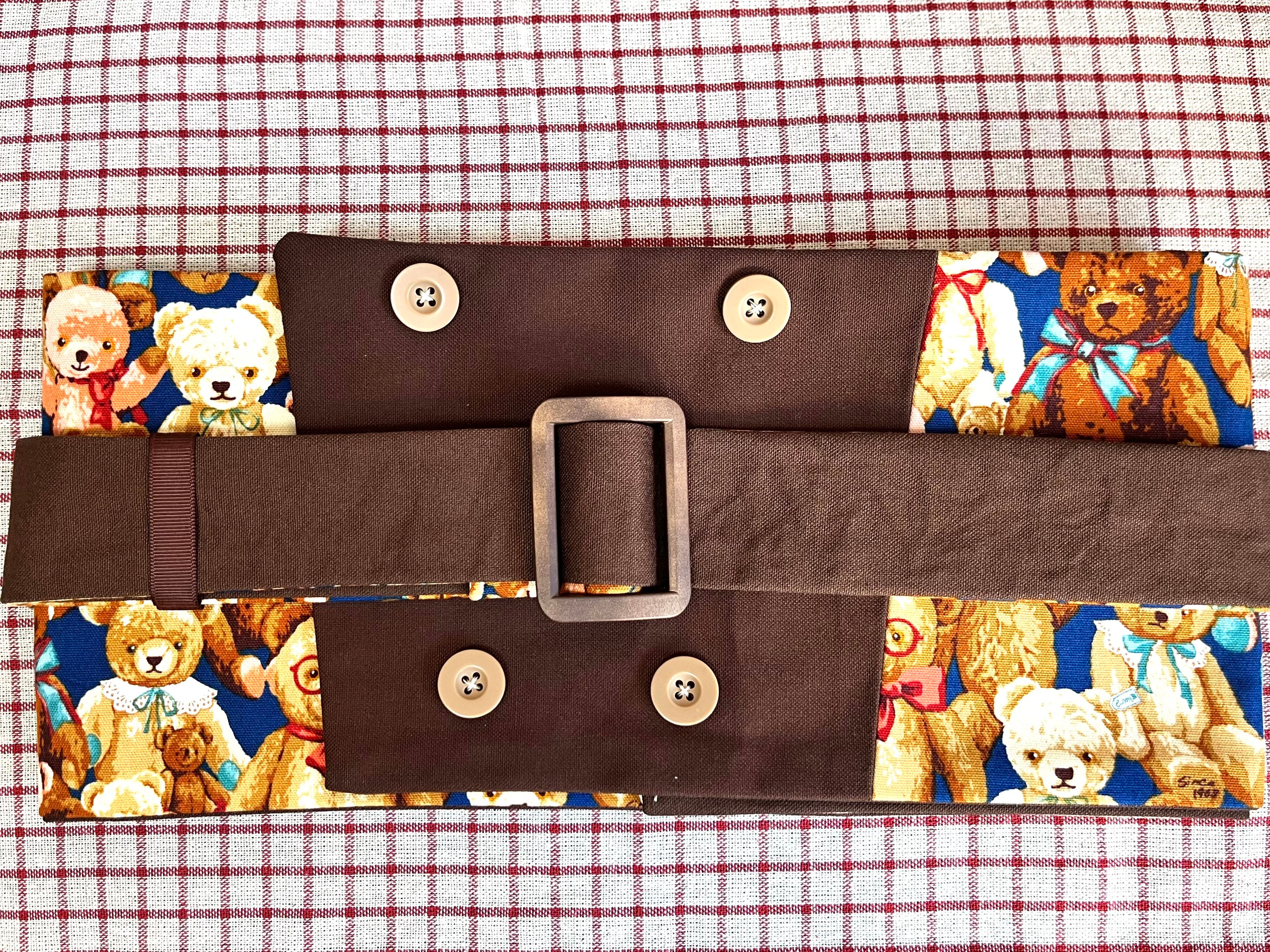 ①ボタンのある面が前に来る様、一周胴体に巻きます。